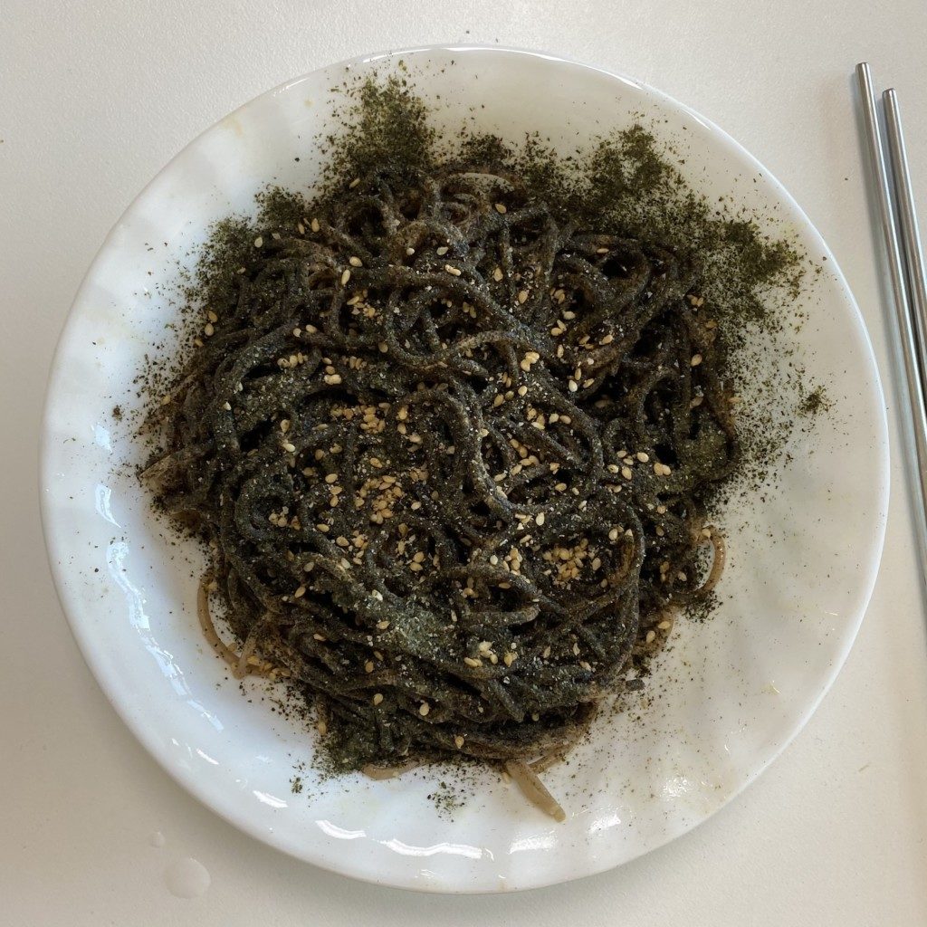 설명에 적혀있는데로 끓는 물에 4분간 면을 삶고, 찬물에 행구고 물기를 쭈욱 잘 짜서 만들고, 간장이랑 기름 소스 넣고 잘 섞은 담에 깨가루 잘 부셔서 뿌리고 김가루를 잘 뿌리면 다음처럼 맛있는 ㅋㅋㅋㅋ
